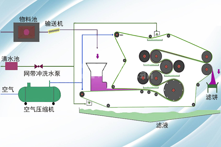 含水85%左右的濕物料經(jīng)過(guò)皮帶輸送機(jī)連續(xù)進(jìn)入料斗中(物料占帶寬可調(diào)節(jié)), 先通過(guò)一個(gè)獨(dú)立的濃縮段將大部分的自由水濾除減小物料的流動(dòng)性再經(jīng)過(guò)內(nèi)外兩條環(huán)狀濾帶在驅(qū)動(dòng)輥帶動(dòng)下,由螺旋壓料輥分布均勻,開(kāi)始進(jìn)入下彎的弧形楔形區(qū)內(nèi),進(jìn)行初壓脫水,緊接著進(jìn)入低壓區(qū)內(nèi),一個(gè)帶“L”型壓條的壓輥將水份大量壓出,并保證水份從兩邊排出,隨后進(jìn)入對(duì)夾擠壓高壓區(qū),內(nèi)外濾帶繞過(guò)幾組直徑遞減的對(duì)夾擠壓輥,大量水分被緩緩地強(qiáng)力壓出,形成可壓榨的濾餅,另一方面,濾帶呈“S”型纏繞產(chǎn)生剃增的表面壓力的剪切力,在濾帶張力作用下外層濾帶對(duì)物料產(chǎn)生壓力將物料中的少量水份榨出,由于榨輥直徑逐漸減小,濾帶間物料所受壓力逐漸增加,少量水份不斷排出。物料中大量水份經(jīng)強(qiáng)力對(duì)夾輥擠榨排出,并通過(guò)接水槽收集排放,在內(nèi)外濾帶分開(kāi)后,有耐磨型刮料裝置將內(nèi)外濾帶工作表面上脫水后的濾餅刮下。 后由高壓實(shí)心錐形凸型清洗噴嘴,形成扇形交叉水帶不斷沖洗網(wǎng)帶,以保持持續(xù)的脫水效果。