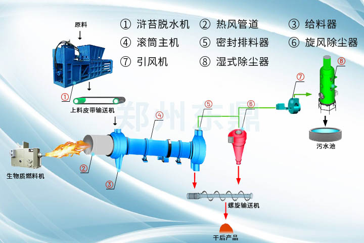 滸苔烘干機(jī)生產(chǎn)線主要由壓榨脫水設(shè)備、熱源、上料機(jī)、進(jìn)料機(jī)、干燥主機(jī) 、出料機(jī)、引風(fēng)機(jī)、卸料器和配電柜、粉碎系統(tǒng)、打包系統(tǒng)等部件構(gòu)成;具體工藝如下水分含量高達(dá)80%以上的濕滸苔經(jīng)壓榨脫水系統(tǒng)擠壓脫水后水分降到65%左右,然后經(jīng)螺旋上料機(jī)進(jìn)入干燥系統(tǒng),在干燥滾筒內(nèi)均布的抄板翻動下,進(jìn)行均勻分散與熱空氣充分接觸,加快了烘干傳熱、傳質(zhì)。在烘干過程中,物料在帶有傾斜度的抄板和熱介質(zhì)的作用下,至烘干機(jī)星形卸料閥排出烘干成品。