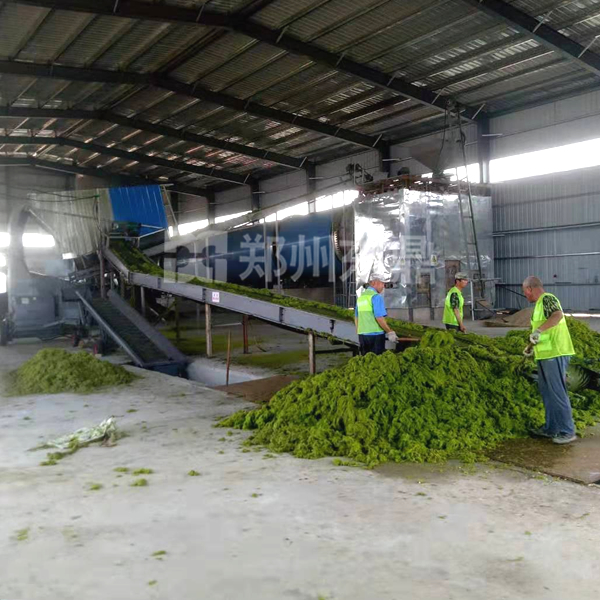 3、滸苔烘干工序:由于滸苔的變質(zhì)速度非???,離開海水的滸苔半天就會發(fā)臭,所以被運(yùn)到車間的滸苔必須快速烘干處理,烘干系統(tǒng)采用東鼎大型三環(huán)烘干機(jī)系統(tǒng),可以快速將滸苔水分降至臨界水分,便于儲存