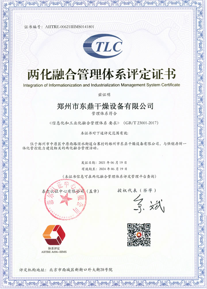 精彩六月喜訊傳,熱烈祝賀鄭州市東鼎干燥設(shè)備有限公司于2021年6月19日順利通過兩化融合管理體系評定并取得證書,這標志著我司在推進工業(yè)化和信息化融合方面取得了新的突破。兩化融合是信息化和工業(yè)化的高層次的深度結(jié)合,是以信息化帶動工業(yè)化、以工業(yè)化促進信息化,走新型工業(yè)化道路,兩化融合管理體系是企業(yè)系統(tǒng)地建立、實施、保持和改進兩化融合過程管理機制的通用方法,通過兩化融合管理體系認證,為我公司可持續(xù)發(fā)展提供了科學、有效的指導(dǎo),促進了戰(zhàn)略目標與信息化工作的有機結(jié)合,公司將以兩化融合管理體系為契機,通過信息化系統(tǒng)建設(shè),全面提升企業(yè)管理水平和管理效益,為公司可持續(xù)發(fā)展戰(zhàn)略提供強勁動力!