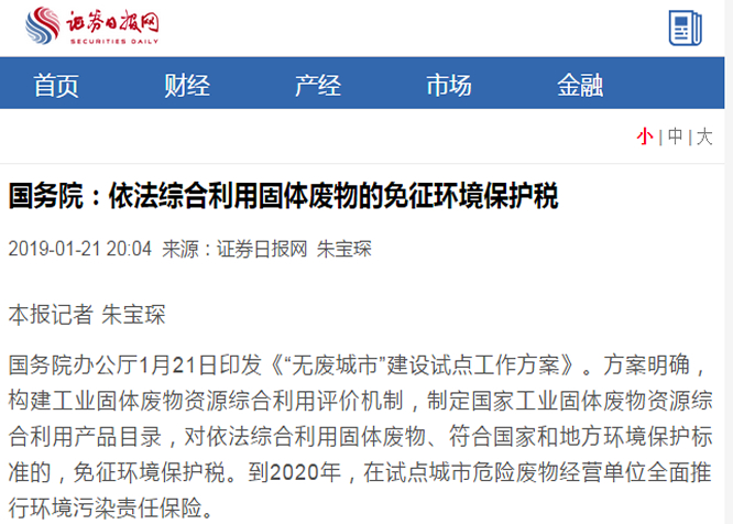 建設綠色供應鏈體系,促進固體廢物減量和循環(huán)利用大勢所趨。國務院辦公廳1月21日印發(fā)《“無廢城市”建設試點工作方案》。方案明確,構(gòu)建工業(yè)固體廢物資源綜合利用評價機制,制定國家工業(yè)固體廢物資源綜合利用產(chǎn)品目錄,對依法綜合利用固體廢物、符合國家和地方環(huán)境保護標準的,免征環(huán)境保護稅。到2020年,在試點城市危險廢物經(jīng)營單位全面推行環(huán)境污染責任保險。